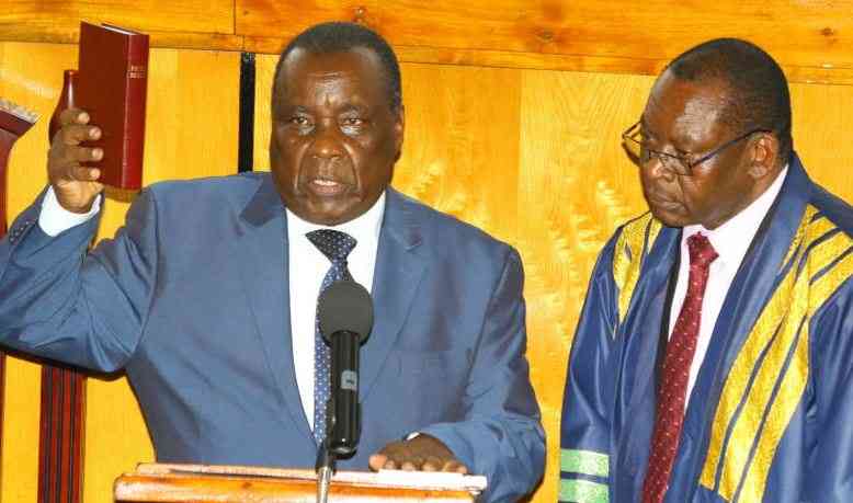 Former Kisii County Assembly Speaker David Kombo being sworn into office by County Clerk James Nyaoga after he was elected as the new speaker after garnering 45 votes defeating his closest challenger Rashid Minyonga who got 22 votes. [File / Standard]