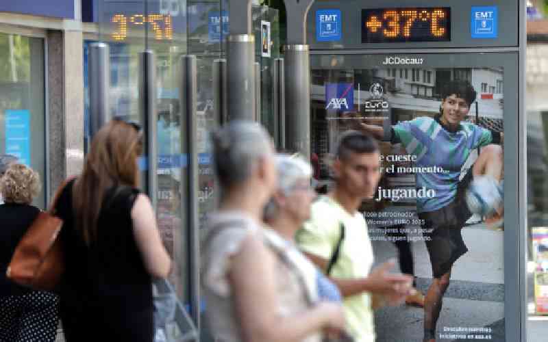 People stand at a bus stop showing a temperature of 37 degrees Celsius during a heatwave in Madrid, on July 1, 2025. Spain had its hottest June on record last month, with an average temperature of 23.6 degrees Celsius (74.5 degrees Fahrenheit), the Aemet national weather service said today.AFPCaption