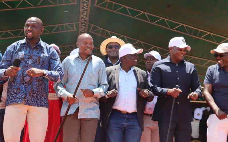 From left: Interior CS Kipchumba Murkomen, DP Kithure Kindiki, Senator William Kisang and President William Ruto’s aids Farouk Kibet during women empowerment drive in Sambarir, Elgeyo Marakwet, on October 4, 2025. [Peter Ochieng, Standard]