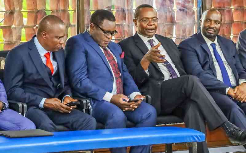 Bungoma Governor Ken Lusaka (second left) and Busia Governor Paul Otioma (second right) during Senate Mashinani sitting in Busia County Assembly, on October 7, 2025. [Elvis Ogina, Standard]