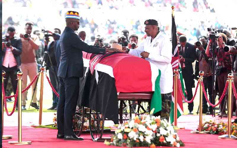 Former Prime Minister Raila Odinga’s Son Raila Junior place his father’s Panama hat on the casket at Nyayo National Stadium during the State Funeral Service on October 17, 2025. [Boniface Okendo, Standard]