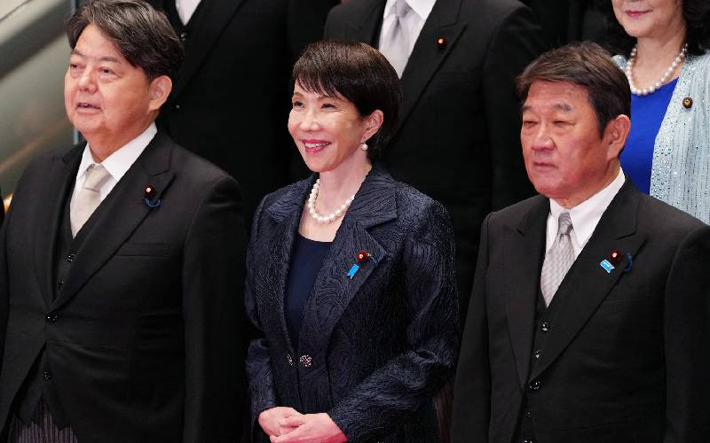 Japan’s new Prime Minister Sanae Takaichi (centre) and members of her cabinet in Tokyo on October 21, 2025. [ AFP]