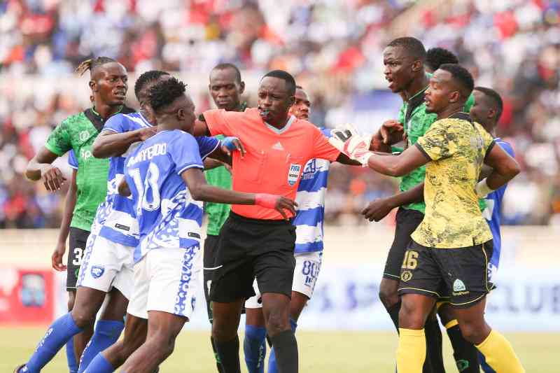 Referee Peter Kamaku (second right) lead his team in Gor Mahia and AFC Leopards during FKF Premier League match at the Nyayo National stadium on April 21, 2024. [Jonah Onyango, Standard]