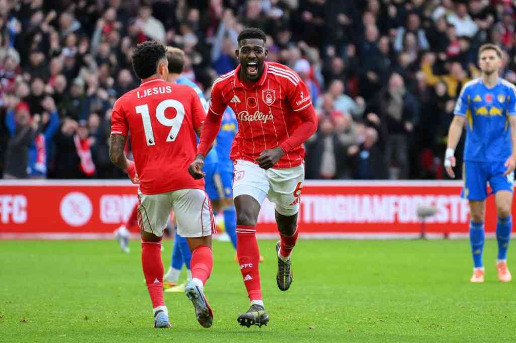 Ibrahim Sangare of Nottingham Forest celebrates after scoring a goal to make it 1-1 during the Premier League match vs Leeds United at the City Ground in Nottingham, United Kingdom, on November 9, 2025. (Jon Hobley/MI News/NurPhoto via AFP)