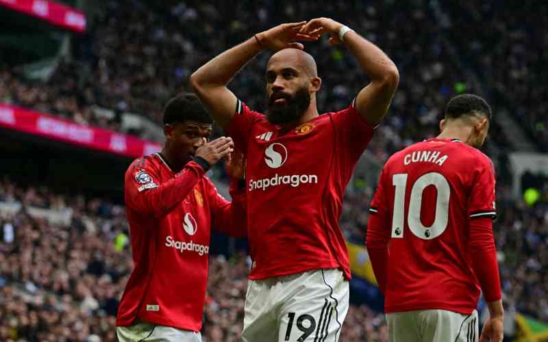Manchester United’s Cameroonian midfielder Bryan Mbeumo celebrates after scoring their in the English Premier League vs Tottenham Hotspur at the Tottenham Hotspur Stadium in London, on November 8, 2025. (Ben STANSALL / AFP)