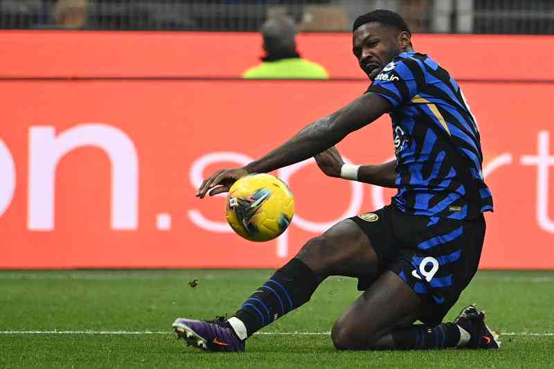 Inter Milan‘s French forward Marcus Thuram dives for the ball during the Italian Serie A football match between vs Bologna at the San Siro Stadium in Milan on January 15, 2025. (Isabella BONOTTO / AFP)