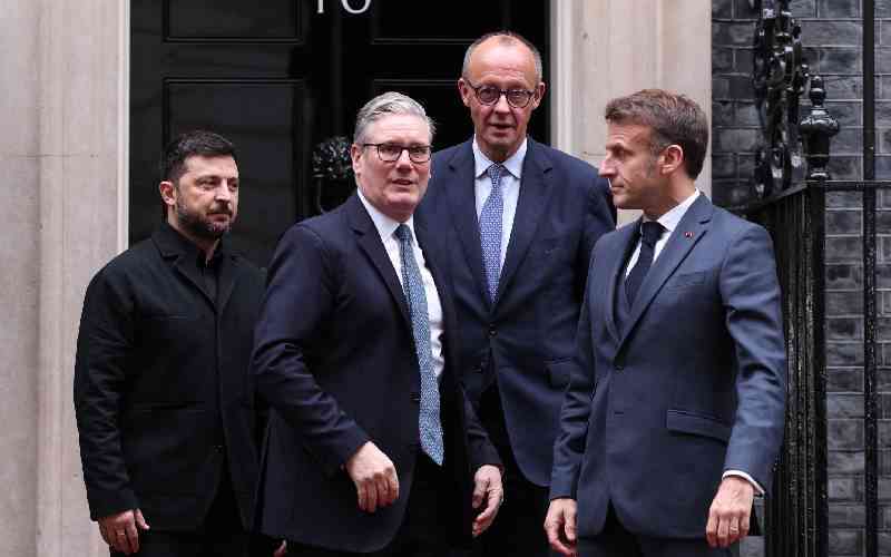 Ukraine’s President Volodymyr Zelensky, Britain’s PM Keir Starmer, Germany’s Chancellor Friedrich Merz and France’s President Emmanuel Macron at 10 Downing Street after a meeting in central London on December 8, 2025. [AFP]