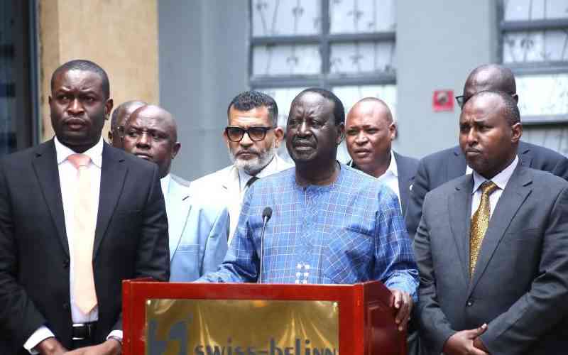 The late ODM leader Raila Odinga (centre), Secretary General Edwin Sifuna (left), Minority Leader Junet Mohamed (right) after ODM Central Committee meeting in Nairobi, on April 2, 2025. [Boniface Okendo, Standard]