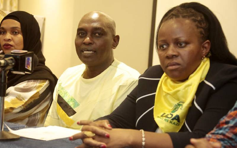 UDA National Election Board Chairman Anthony Mwaura, Vice-Chairperson Ummi Bashir (left), and Aurelia Rono during a press conference in Nairobi on March 25, 2022. [File, Standard]