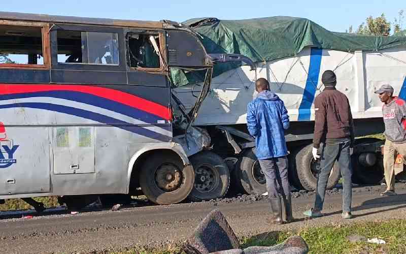 A bus that collided with a trailer at Tunnel area near Fort Ternan trading centre on Muhoroni Junction–Londiani Junction road, on January 6, 2026.