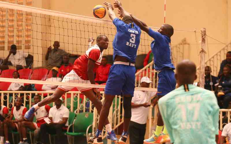 Kevin Wanjala (left) of Equity Bank spikes against Fidelis Kipruto and Francis Muguna of Kenya Navy during their 2026 Kenya Cup match at Nyayo Gymnasium. [Stafford Ondego, Standard]