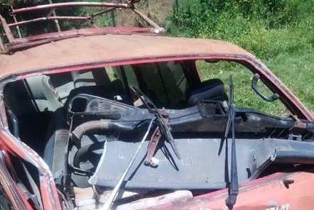 The incident left the vehicle badly damaged, with its front section smashed, the windscreen shattered, and the seats dislodged.