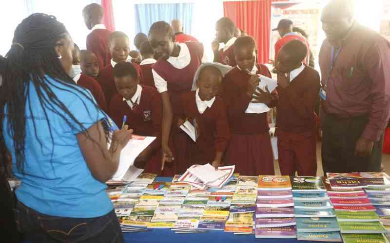 Pupils admiring textbooks during the Nakuru regional book fair in Nakuru city on June 2,2022. [Kipsang Joseph,Standard]