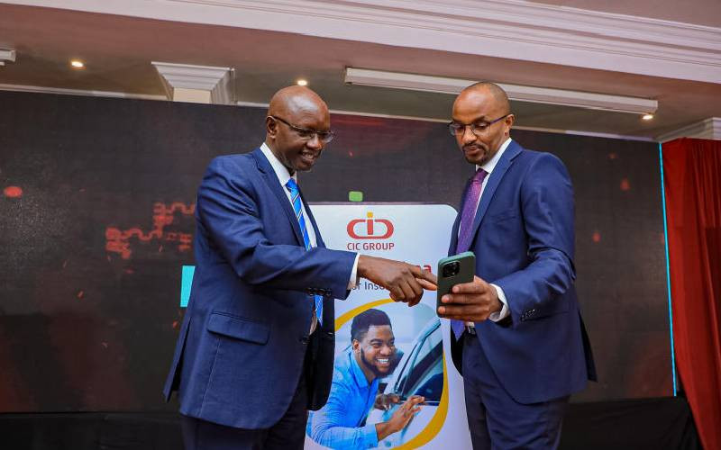 CIC General Insurance MD Fred Ruoro (left) demonstrates the monthly Easy Bima insurance cover onboarding process to the CIC GCEO Patrick Nyaga. [File, Standard]