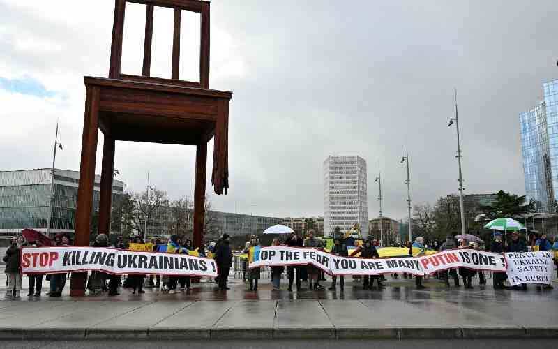 Protesters hold banners as a new round of talks between Russian, Ukrainian and US negotiators aimed at finding a solution to four years of fighting in Ukraine, takes place in Geneva on February 17, 2026. [AFP]