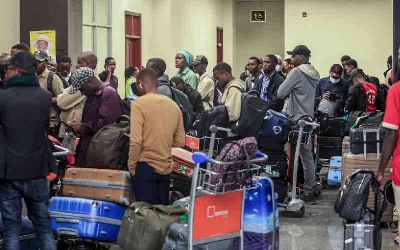 Ugandan students evacuated from Iran wait with their belongings to pass security checks after arriving from Turkey at Entebbe International Airport in Entebbe on March 5, 2026. [AFP]