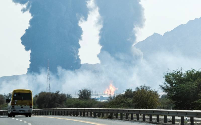 Smoke and flames rise from an energy installation in the Gulf emirate of Fujairah on March 14, 2026. [AFP]