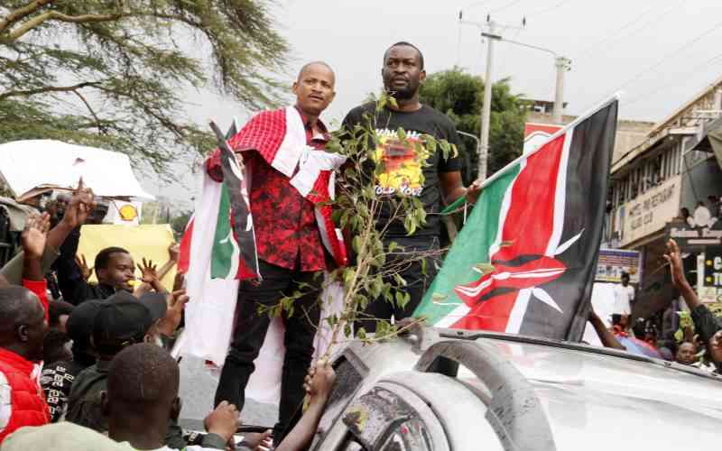 Babu Owino and ODM SG Edwin Sifuna at the Narok rally as teargas and rain fail to stop the Linda Mwananchi brigade. [George Sayagie, Standard]