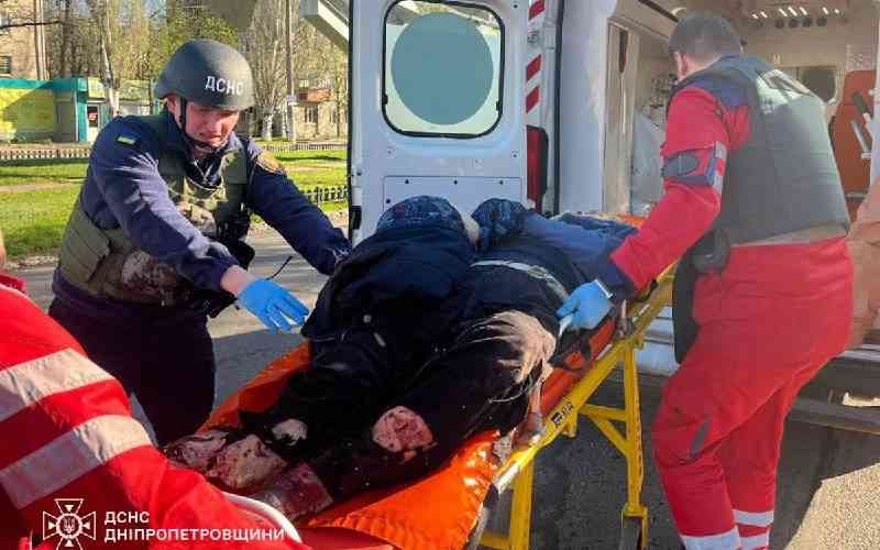 A firefighter and a medic carry an injured person to the ambulance following a drone strike in Nikopol, Ukraine on April 7, 2026. [AFP]
