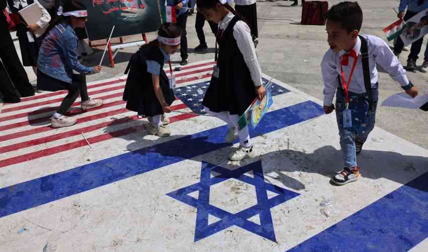 Iraqi school children play on US and Israel flags on the ground during anti-US and Israeli demonstration in Baghdad. [Ahmad Al-Rubaye, AFP]