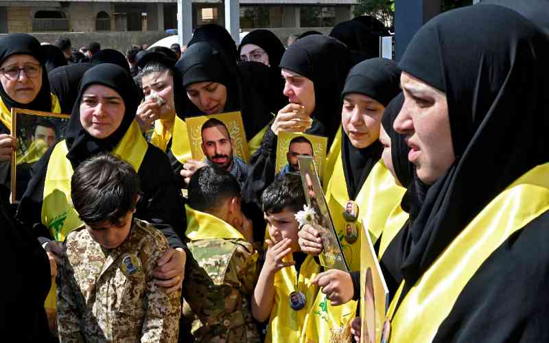 Mourners hold portraits of members of the Iran-backed militant group Hezbollah who were killed in southern Lebanon during their funeral in the Kafaat area in Beirut’s southern suburbs on April 20, 2026. [AFP]
