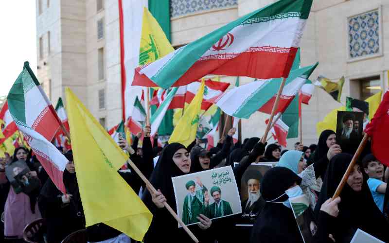 People carry Hezbollah, Iranian and Lebanese flags, and portraits of Iran’s supreme leader Ayatollah Mojtaba Khamenei during a memorial ceremony at the Iranian Embassy in Beirut on April 22, 2026. [AFP]